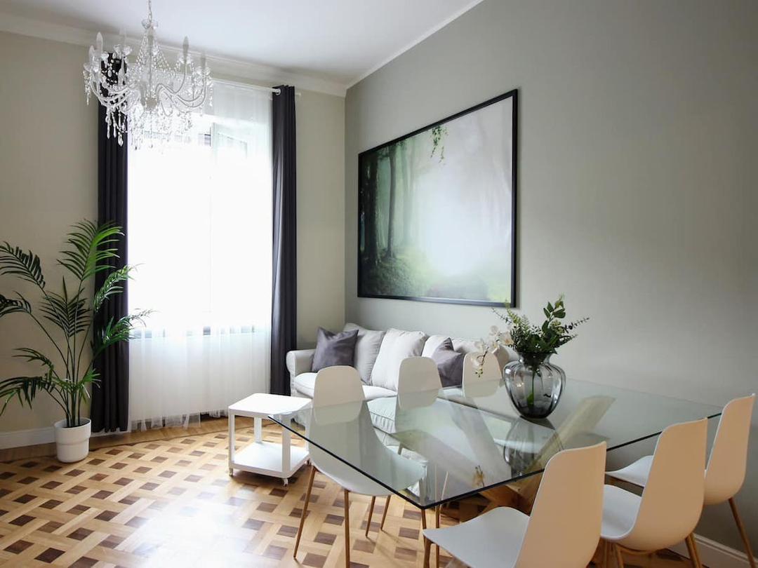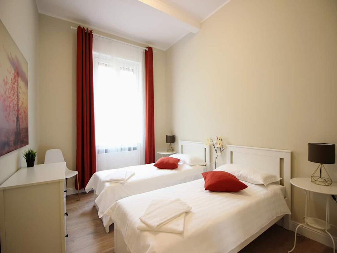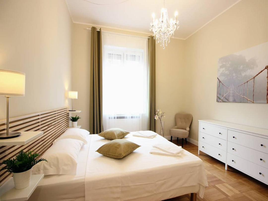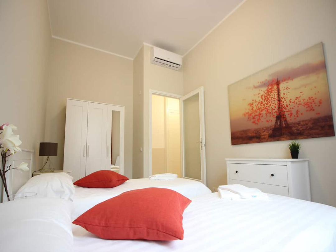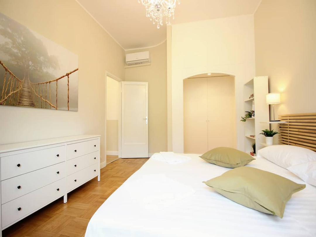 This spacious 200 m² apartment offers 4 refined bedrooms 🛏️ and 2 modern bathrooms 🚿, comfortably accommodating up to 8 guests. Large windows flood the interiors with natural light 🌞, enhancing a carefully curated mix of contemporary design and historical charm. The apartment is perfect for relaxing and enjoying every comfort, with a private living room 🛋️, fully equipped kitchen 🍳, WiFi, air conditioning ❄️, washing machine & dryer 🧺, and dishwasher.